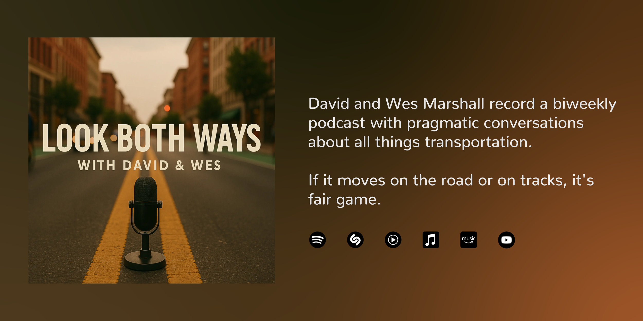 If you are looking for great conversations about all things transportation, Look Both Ways Podcast is the place for you. David and Wes Marshall record bi-weekly to have frank, pragmatic discussions about transportation in our country.